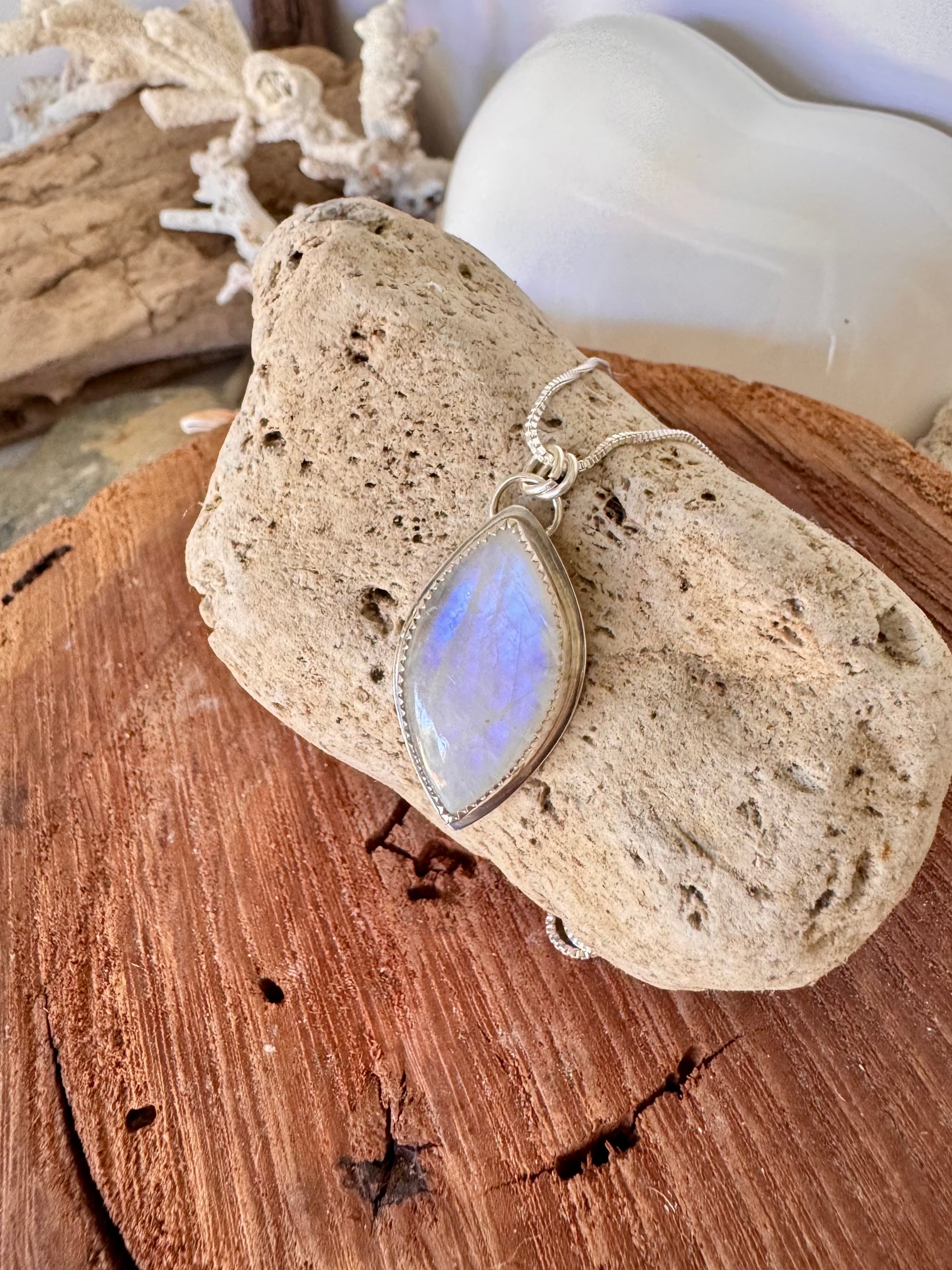 A gorgeous Rainbow Moonstone necklace in a unique Marquis shape.