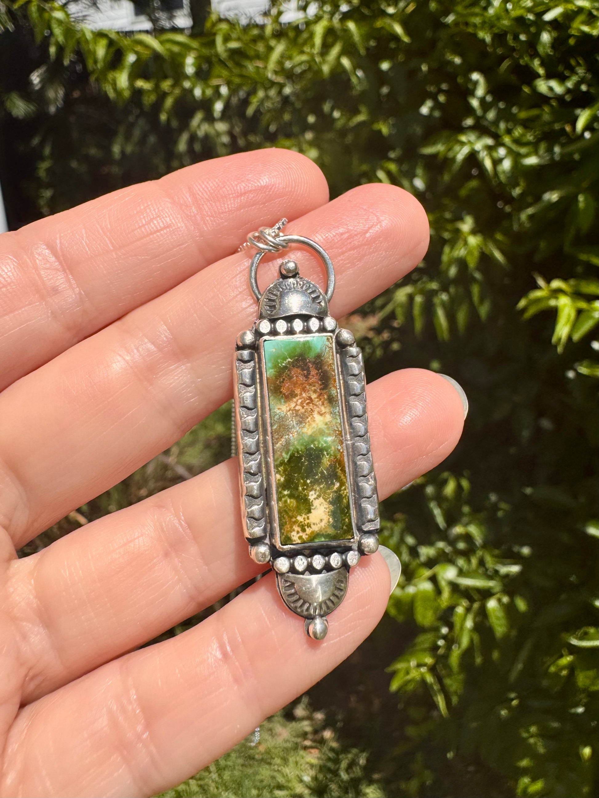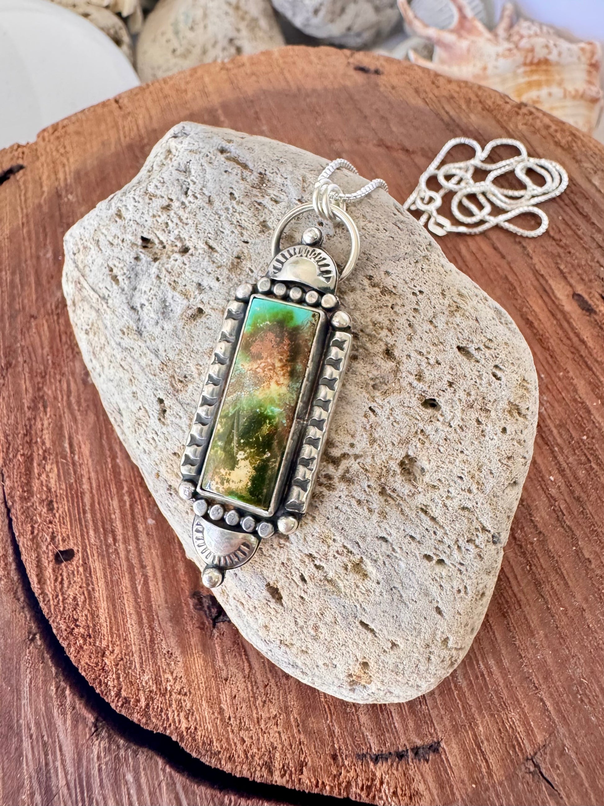 An exceptionally unique Pilot Mountain turquoise from Nevada, USA has been set in a one-of-a-kind, handmade, sterling and fine silver setting. This stone is a medley of earthy greens and browns and perfect turquoise.