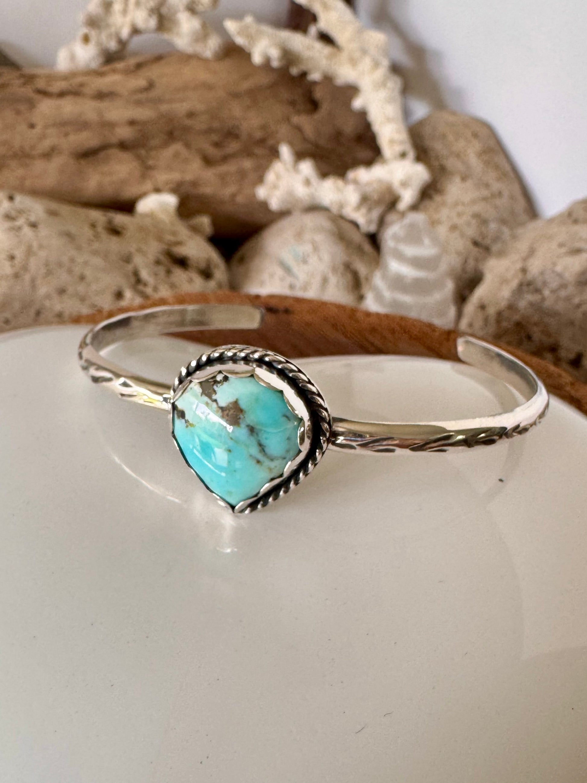 You will love this solid silver cuff bracelet with a very unique turquoise stone. Handmade with love, the silver has been carefully stamped by hand to create a one-of-a-kind piece of jewellery that you will treasure forever.