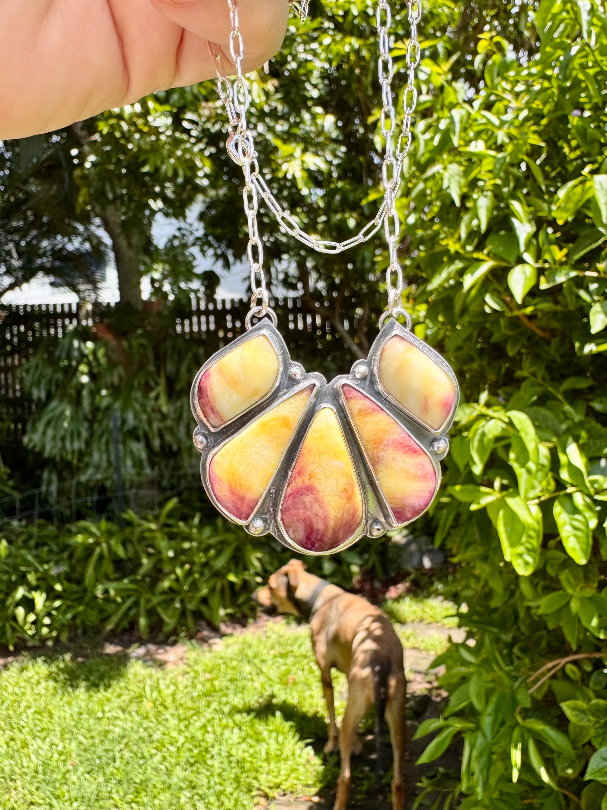 Five beautifully toned spiny oyster stones set in a handmade sterling and fine silver setting, made with impeccable attention to detail and care.