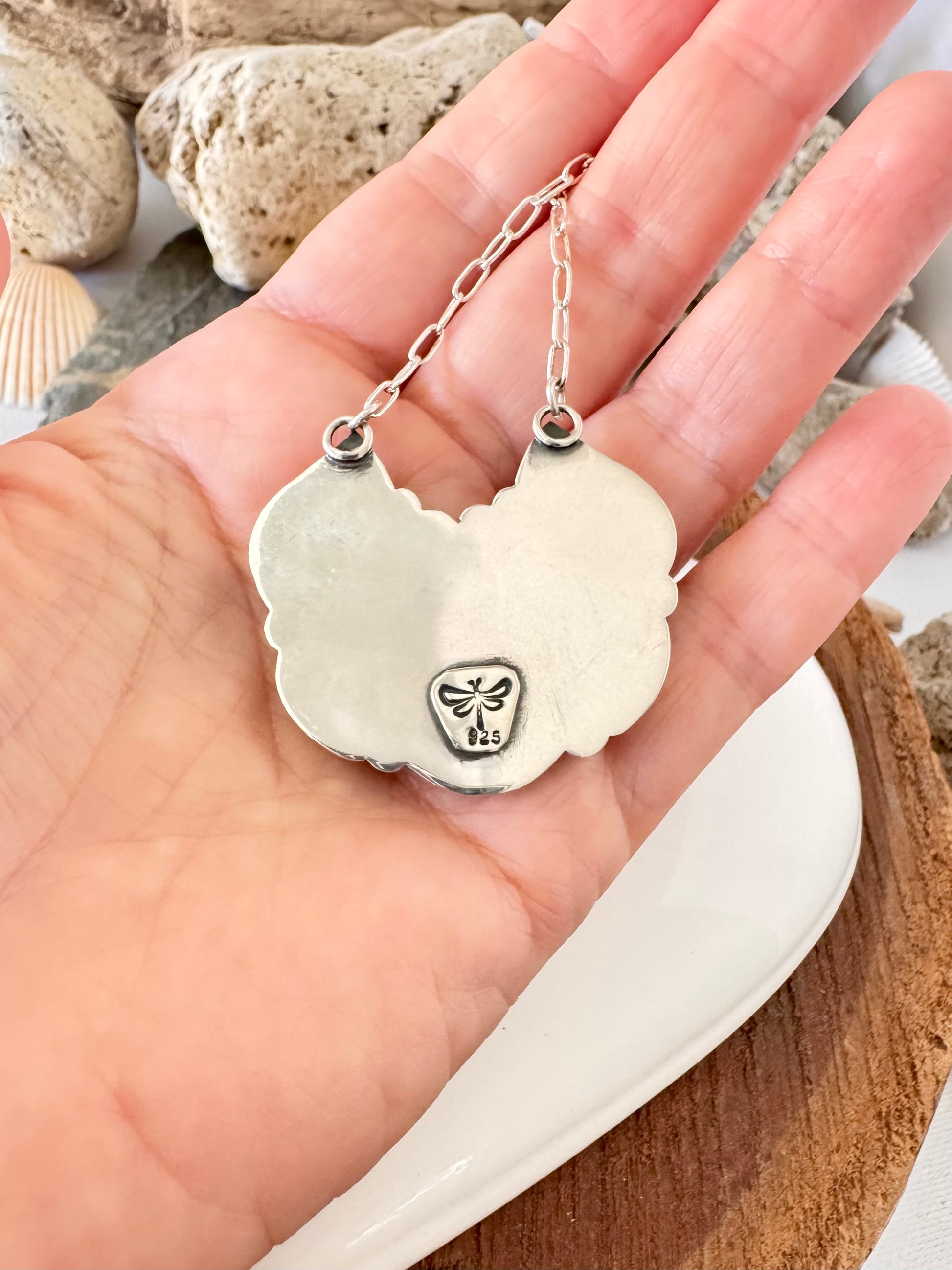 This necklace measures 17.5" in total. It has been oxidised and polished to enhance the details. The reverse is marked 925 for sterling silver and also shows my makers mark - a dragonfly.