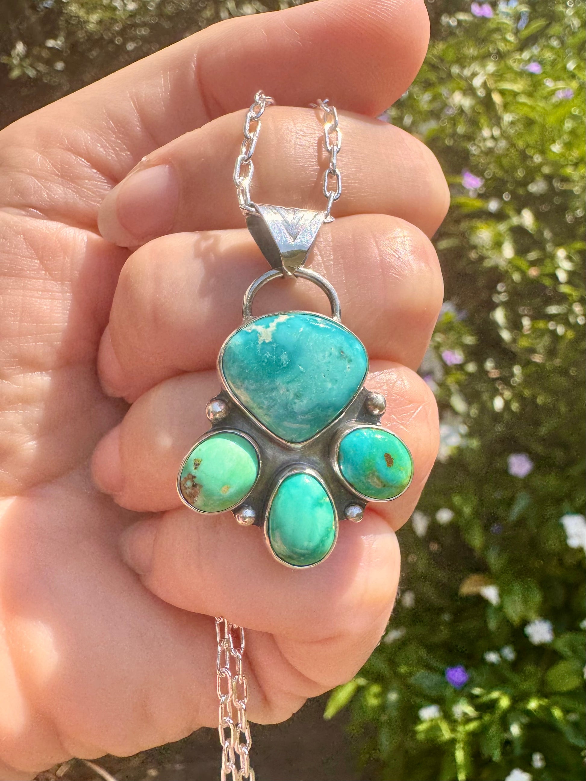 Beautiful, vibrant shades of blue in this 4 stone necklace. A delightfully pleasing mix of Whitewater and Emerald Valley turquoise.