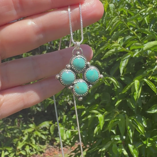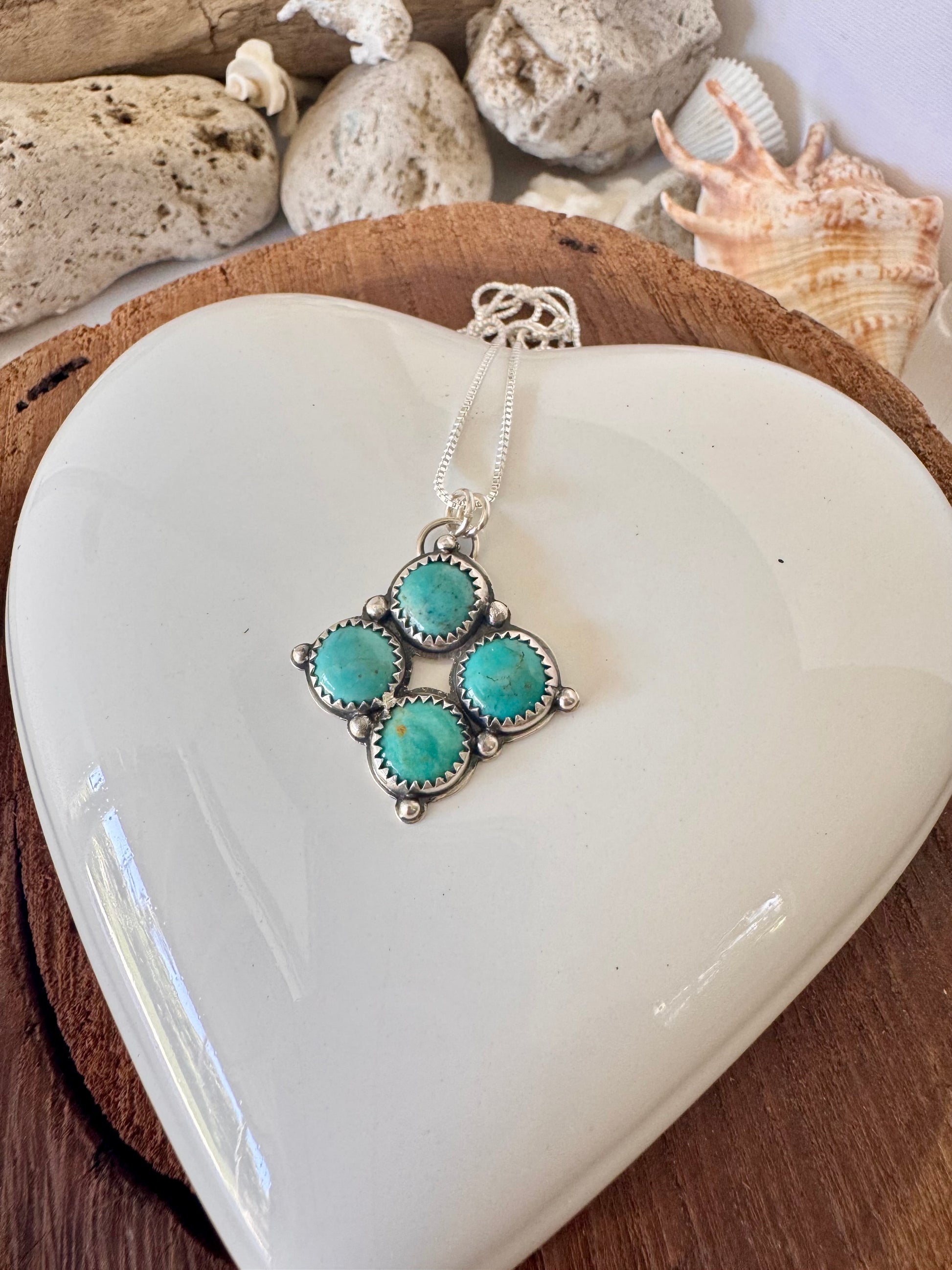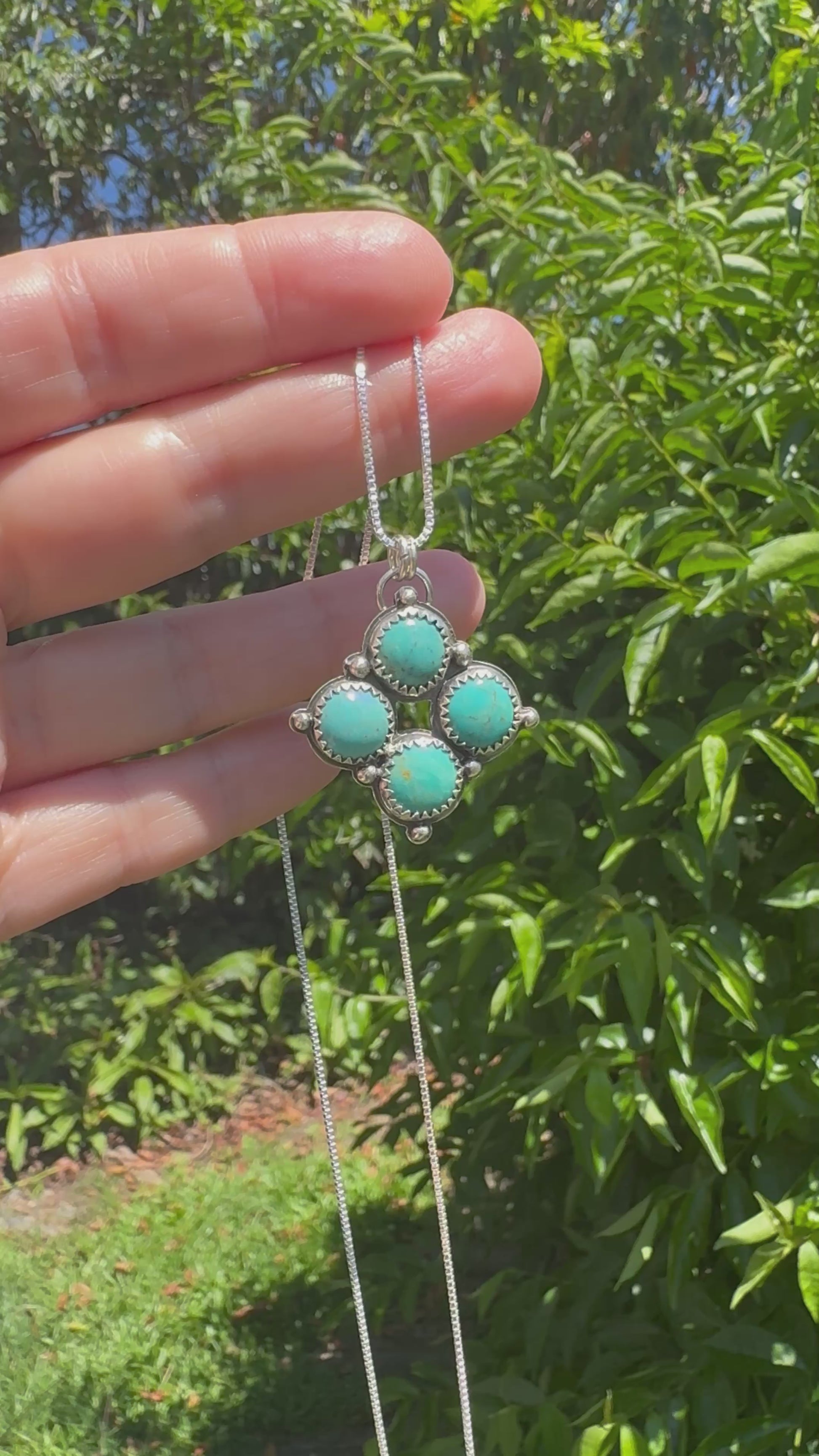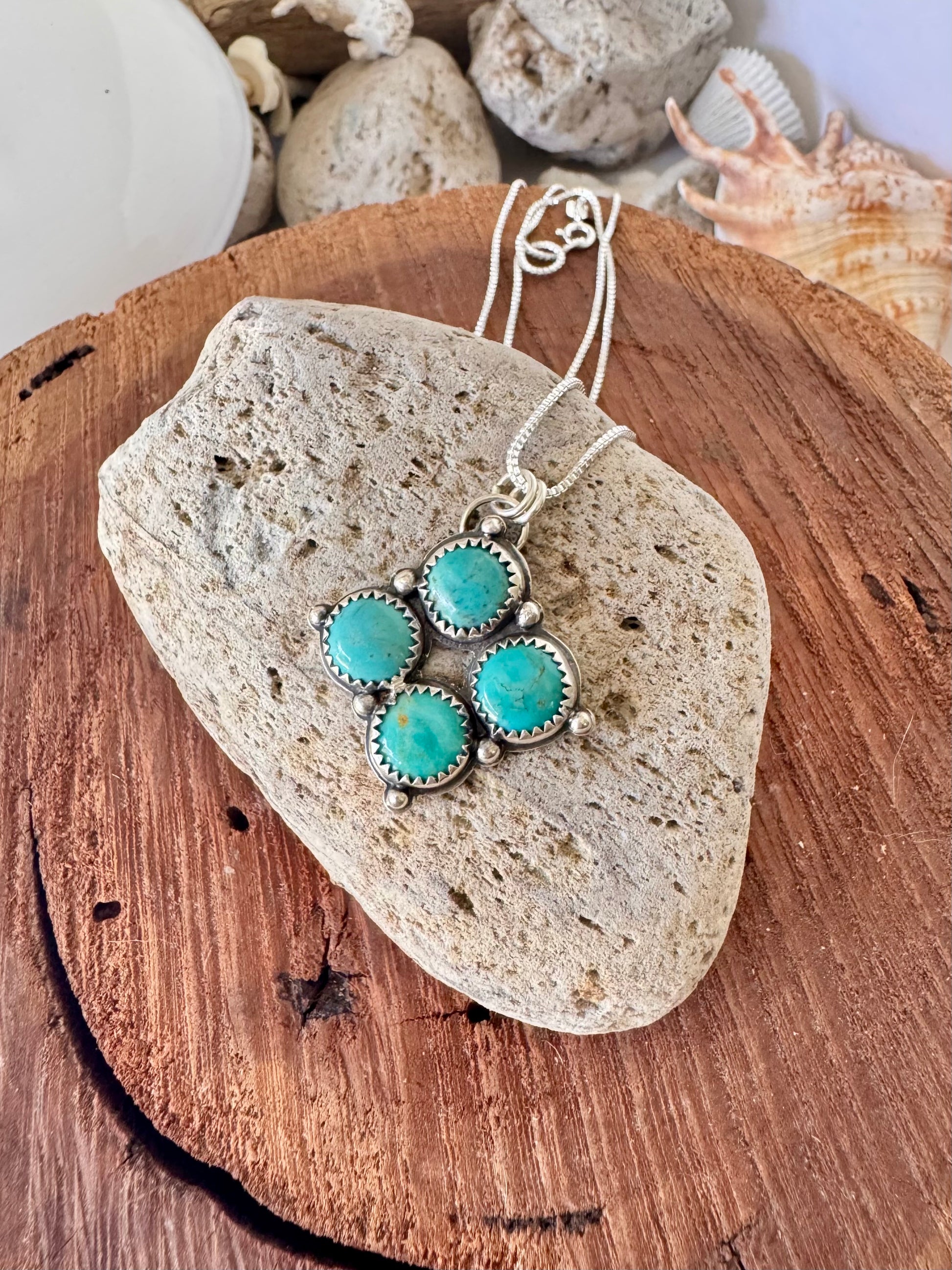 Sterling silver and 4 genuine Sonoron Gem turquoise rounds set in an entirely handmade sterling and fine silver setting.